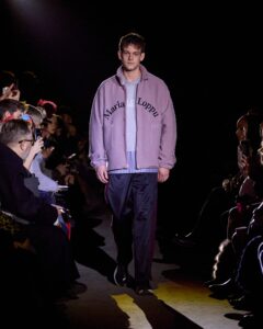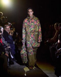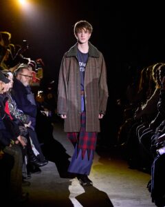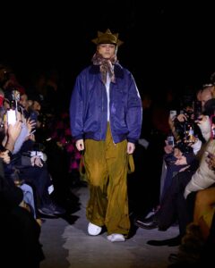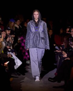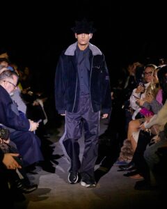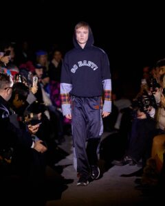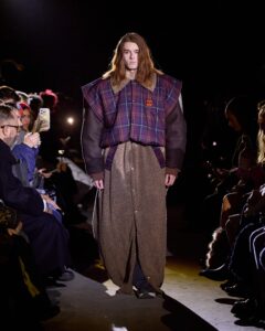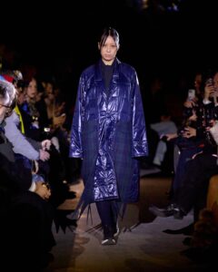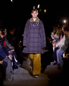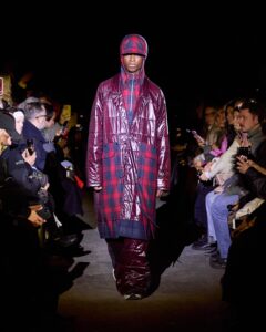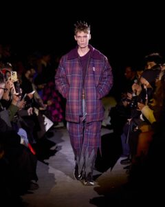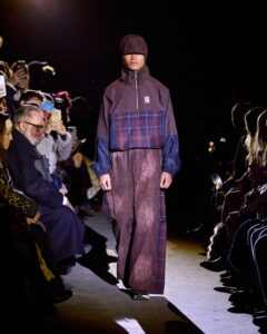 コレクション全体の色彩は、深みのあるネイビーやパープル、ブルー調が主軸になり、ダークトーンにまとまっていた。レッドやパープルのチェック柄は登場しても、やはり暗さがこびりついている。スタイルはアウトドアやワークウェア、ストリートが混じり合うエクロス・スタイル。だが、2024AWや2025SSとは違い、全体のトーンが沈んでいるため、かすかにアンダーグラウンドな香りが漂う。