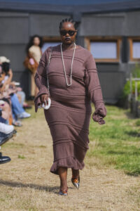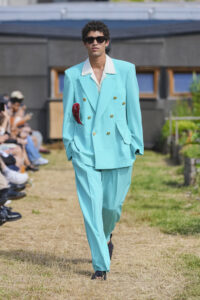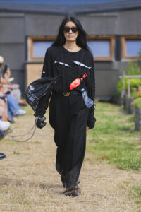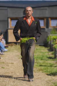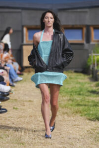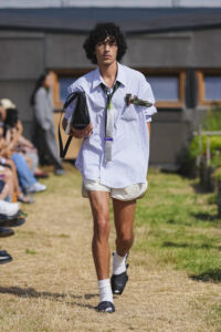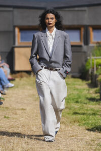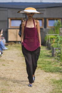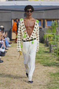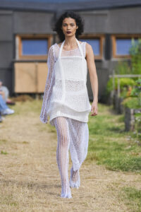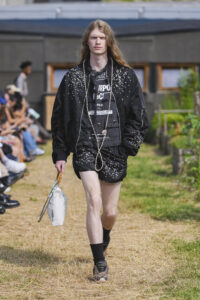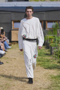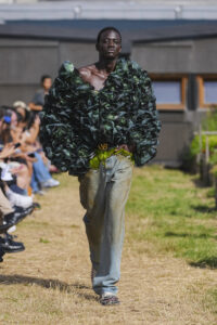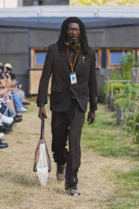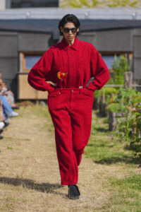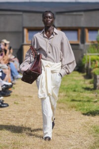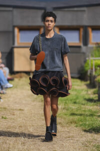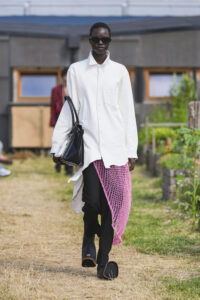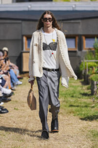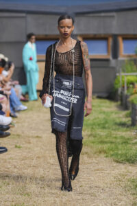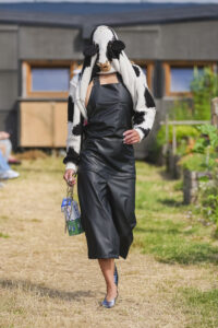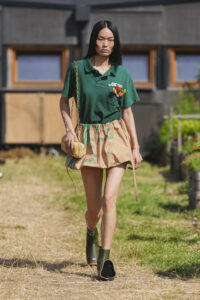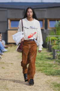 女性モデルの中には、コンサバティブな装いをした者もいる。だが素材は、ラグジュアリーとはまったく異なるもの。ベージュのシャギーな素材は荒々しい獣毛に近く、フリンジがところどころに作られ、白地に緑のタイポグラフィがプリントされたスカートやジャケットは、農作物の出荷袋がオーバーラップする。