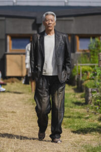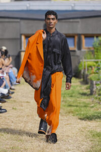 金目鯛漁で廃棄される魚網を、リサイクルすることに情熱をかけた人との出会い。“食”を通じて社会を耕す Sky High Farm の思想との出会い。廃業した那須の鶏肉店、高知の漁港で生まれたフィッシュレザーやジビエの素材との出会い。そうした命と暮らしの原点から生まれる素材との出会いが、このコレクションをかたちづくっていた。