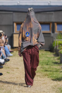 ダブレットらしいユニークなフォルムのアイテムも健在だ。前中心のファスナー、ラグランスリーブと思しき切り替え線が、頭を隠してもなお上に伸び続けるスウェットの形は、右胸のワッペンから察するにバナナを模ったものだろうか。だが、スウェットの色は黄色くない。くすんだ黒と濁ったオレンジ。腐りかけた果実のような色合いは、消費の果てにある現実を見せつける。