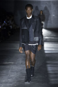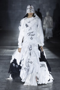 だが、それはクラシックに対する反抗ではない。むしろ、伝統へのある種のリスペクトが土台にあるからこそ、そこに「ズレ」が浮かび上がってくる。通常なら綺麗に見せるはずのクラシックを、激しいパッチワークや布の断ち切りをあえて露出させる作りは、仕立てという営みに敬意を払いつつ、その歴史を少しだけ捻ってみせている。たとえば、ファーストルックを飾ったブラックジャケットは、身頃と袖の切り替えによって、構築的であると同時に解体的でもある。そのアンビバレンスこそが、今季のCOTDの核心だった。