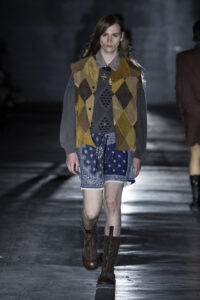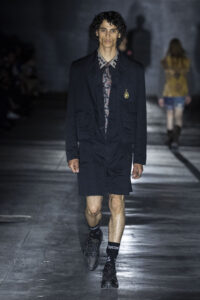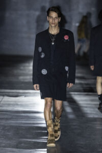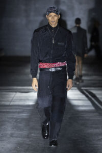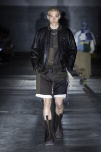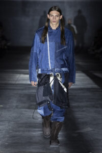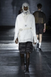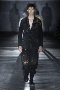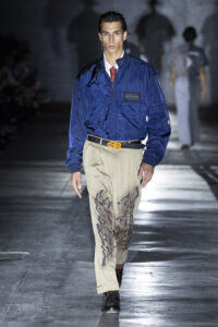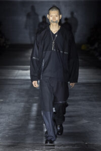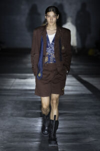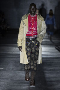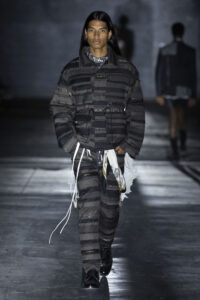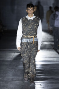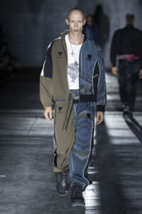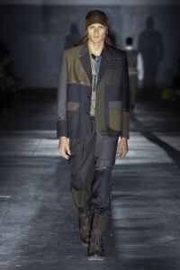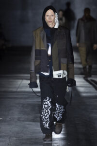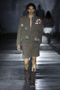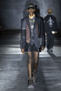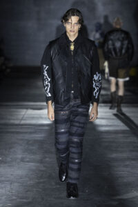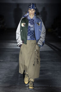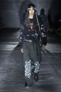 だからこのコレクションは、「伝統を壊す」ものではない。むしろ、「伝統を複数化する」ものだと言える。西洋のフォーマルウェアという単線的な歴史に、アジアの手仕事やストリートの言語を縫い合わせていく。それは対立ではなく、共存でもなく、「隣り合わせの異物」を肯定する構えである。そして、その構えは、たとえば「パンク」や「ミリタリー」を単なる記号にせず、個々の背景ごと保存しようとする態度にもつながっていく。