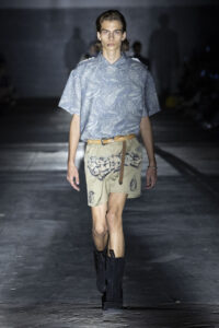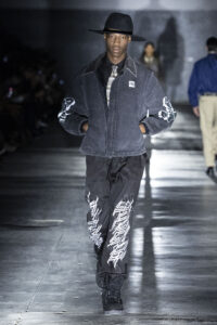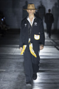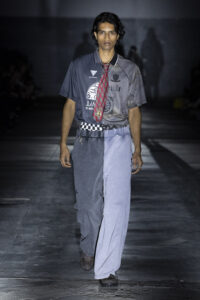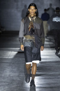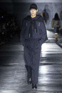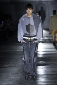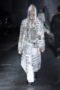 さらに印象的だったのは、“西洋的な正統”に対して、“アジア的な反復”が並列的に差し込まれていること。刺繍、バンダナ、レイヤード、メッセージパッチ──そこにはどこか「祈り」に近いものすら感じられる。服は単なる表現手段ではなく、文化を編み直すメディウムとなっている。西洋の直線的な歴史観に対し、幾重にも折り重なる布が語るのは、分岐し、循環し、ときにやり直されるような時間感覚だ。1枚のジャケットが持つ構造線は、単に縫製のためにあるのではなく、過去と現在を繋ぎ直す“縫い目”そのものなのだ。