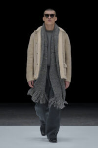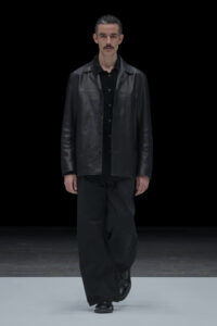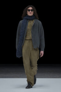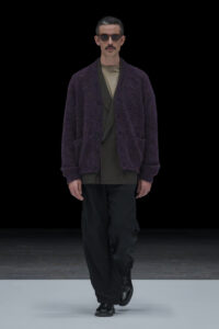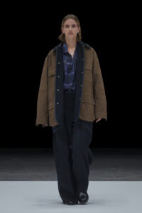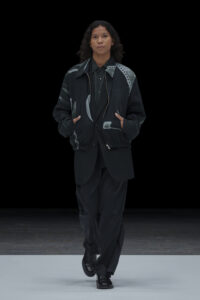 オーソドックスなスタンドカラージャケットには、左右の身頃に三角フラップのポケットが付いている。だが、モデルはジャケットの脇にあるスリットから両手を通している。身頃の裏側から、ポケットの袋布に手を通しているのだろうか。それとも、スリットと思える場所を利用したポケットがあり、その袋布に手を通しているのだろうか。見ているだけでは真実はわからない。