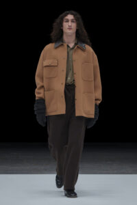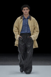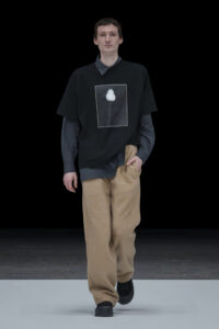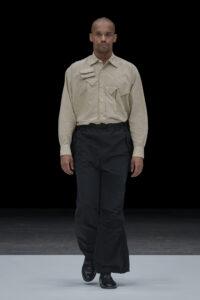 色褪せた素材感のシャツを着るモデル。身頃にはポケットが不規則なサイズ、不規則な場所に複数取り付けられていた。スタイリングは、シャツとパンツという正統派のメンズルックだというのに、歪なポケットがベーシックの文脈をささやかにかき乱す。