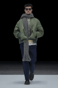 ミリタリーのフライトジャケットを着用したモデルがいる。身頃のポケットに手を入れているが、身頃から袋布に入れた左右の手が飛び出し、シュールな表情を見せている。ルックの佇まいはシリアスだが、どこかコミカルだ。