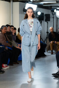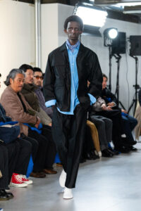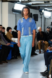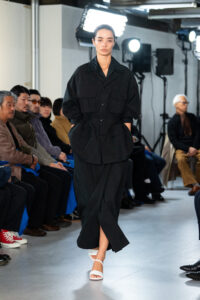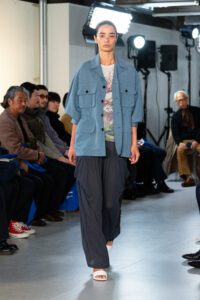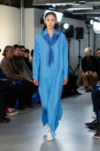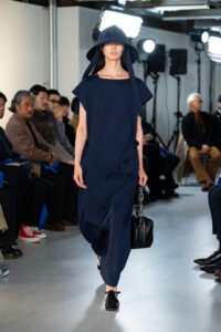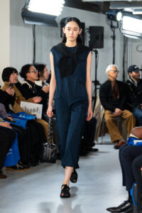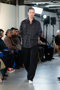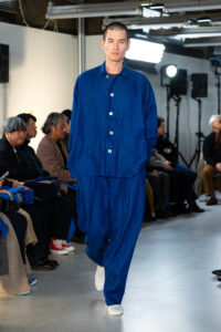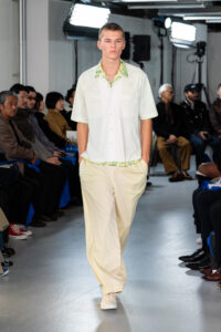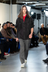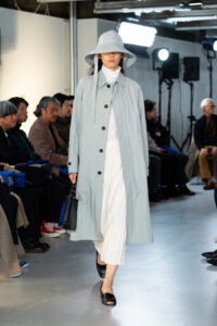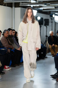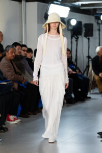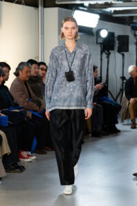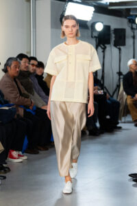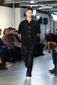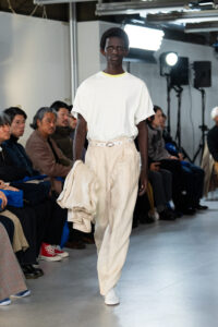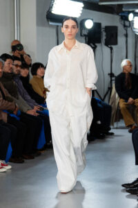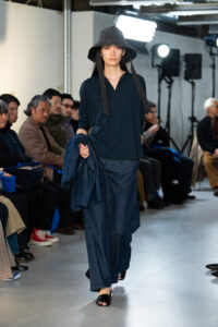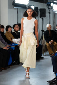 アイテムは日常着としてリアルなフォルムをベースに制作。シャツ、トップス、テーラードジャケット、パンツ、スカート。いずれのアイテムの形にも“ゆらぎ”が入っていた。服が体の上で浮遊しているように、モデルたちの姿は優雅だった。いや、優雅という表現はちょっと贅沢により過ぎだろう。より日常に根差した、カジュアルなゆらぎであり、洗いざらしの白いオーバーサイズシャツをTシャツ上から羽織り、フロントボタンを留めずに街を歩くようなリラックス感である。