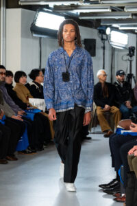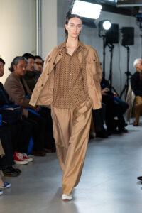 コレクションで最も目を奪われたのは素材。モデルたちが目の前を通り過ぎると、生地の風合いに優しさが滲んでいた。「服を着ることで、心がくつろぐ」。そんなフレーズが浮かんだ、柔らかなムードの生地は、無地を中心に、使用感のある味わい深い表情、光沢、ドレープ性、フェード感、ペイズリーやドットなどの柄、そして合繊素材も用いて、新しいズッカを朗らかに多様に彩る。