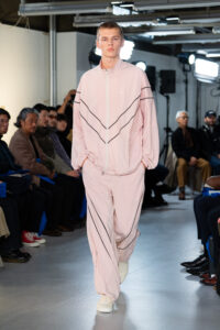 印象的だったアイテムはトラックスーツ。スポーティな服の王道アイテムだが、素材はとろみのある生地を用いて、ドレスに通じる雰囲気を纏っていた。カジュアルな要素の強いアイテムを、エレガントな要素の強い素材で仕立てる。日常のバランスを組み替える手腕が光った。