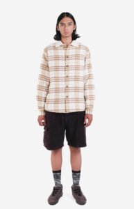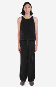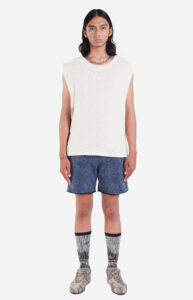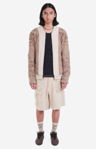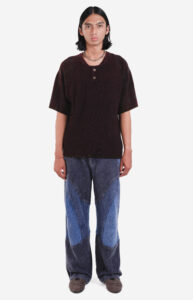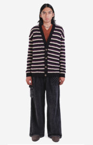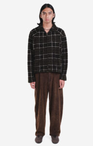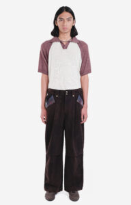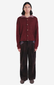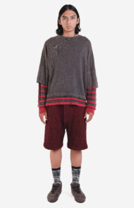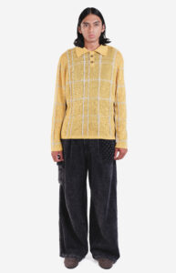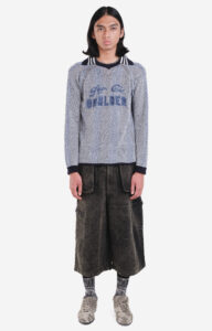 イサ ボールダーのメンズウェアは、黒・茶・灰色と暗いトーンの色が主役で、イエローのように明るいはずの色もどこか暗さを帯びている。スタイルの印象は、クラフトな技術で作られた服が好きなスケーターを呼び起こす。ゆったりとした形のボーダーポロシャツとハーフパンツ。襟付きカーディガンと、フレアに広がり、アウトポケットが付いたハーフパンツ。ハーフスリーブのカットソーの下にボーダーの長袖トップスを重ね着。
