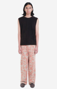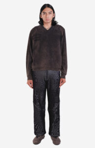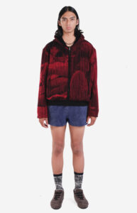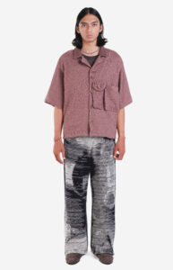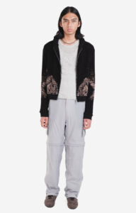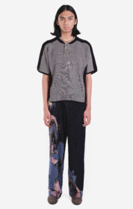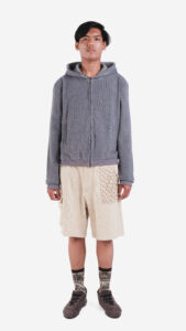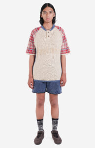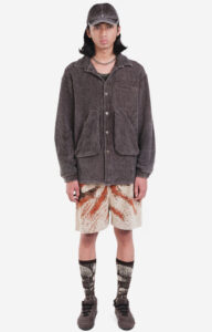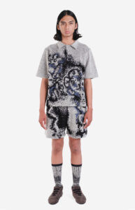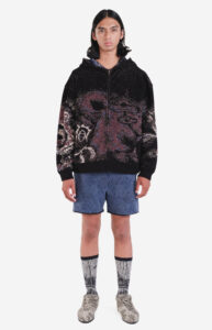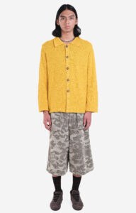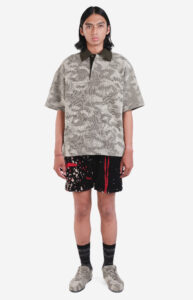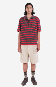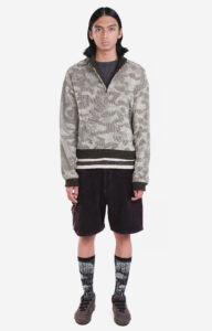 アイテムも着こなしも、片手にスケートボードを持つ姿が浮かぶ。ただし、西洋のそれはと違う。アジアの、亜熱帯な香りが漂う。ストリートウェアに欠かせない、グラフィカルな要素を表現するのはロゴではない。ニットの上で表現された柄は、キャンバスに描かれた抽象画のようで、スポーティな装いに芸術性を加える。